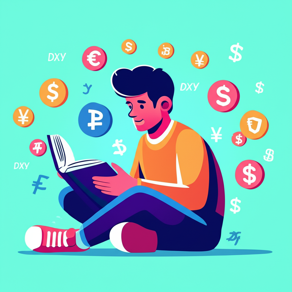 ภาพประกอบบุคคลกำลังอ่านเกี่ยวกับดอลลาร์ Index DXY พร้อมสัญลักษณ์ไทยและไอคอนสกุลเงินโลก