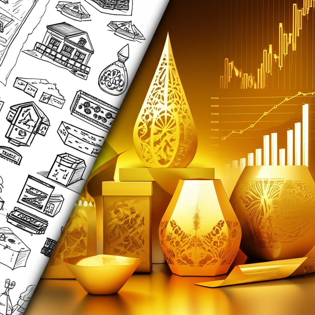 ภาพประกอบกระดาษทองที่เปลี่ยนรูปจากแบบร่างการออกแบบไปสู่ชิ้นงานฝีมือและกราฟการลงทุนในสีสันสดใส