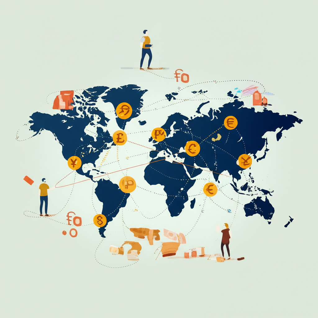 ภาพประกอบเศรษฐกิจโลกที่เชื่อมโยงกันพร้อมสกุลเงินไหลเวียนและผู้คนเปรียบเทียบราคาสินค้า